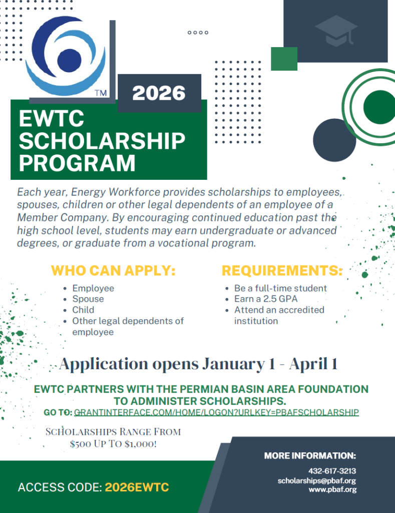 Energy Workforce partners with the Permian Basin Area Foundation to administer the scholarships. Applications will be accepted until April 1 at midnight. If you have questions, contact scholarships@pbaf.org or call 432-617-3213.