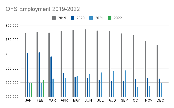 The data, which was collected in mid-February before Russian President Vladimir Putin invaded Ukraine, reported 609,086 total OFS jobs, the highest since September 2021 when total jobs rebounded to 643,057, but still off the pre-pandemic mark in February 2020 of 706,528. The 1.6% growth comes as overall U.S. employers added 678,000 jobs in February, topping analyst’s expectations for two straight months.