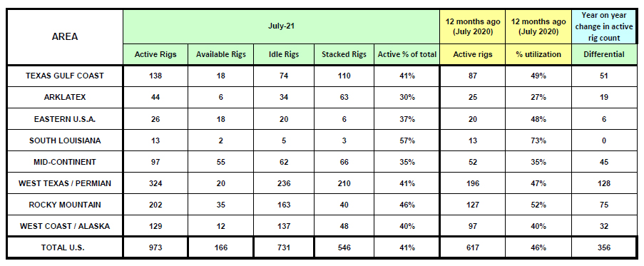 The rig utilization rate inched up from 39% in June to 40% in July. The utilization rate has dramatically increased from pandemic-lows of 17% in April and May of 2020, but remain below pre-pandemic norms of around 45%.